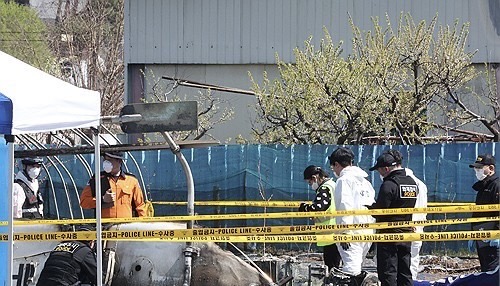 7일 대구 북구 서변동 산불 진화 헬기 추락 지점에서 국토교통부 항공철도사고조사위와 경찰, 소방, 지자체 등이 합동 감식을 진행하고 있다. 전날 발생한 이번 사고로 조종사 정궁호(74)씨가 순직했다.