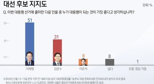국민의힘 김문수 후보는 31%, 개혁신당 이준석 후보는 8%를 각각 기록한 것으로 조사됐다. ‘지지하는 후보가 없다’ 8%, ‘모름·응답거절’ 1%로 나타났다.
