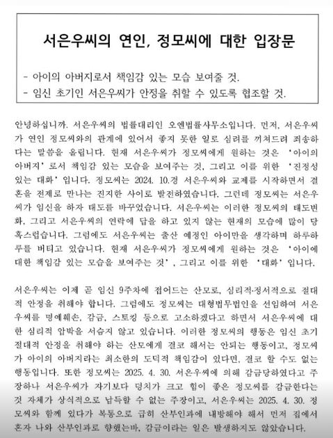 이어 "그럼에도 서은우 씨는 출산 예정인 아이만을 생각하며 하루하루를 버티고 있다. 현재 서은우 씨가 정 씨에 원하는 것은 '아이에 대한 책임감 있는 모습을 보여주는 것', 그리고 이를 위한 '대화'다. 서은우 씨는 이제 곧 임신 9주 차에 접어드는 산모로, 심리적, 정서적으로 절대적 안정을 취해야 한다"라고 설명하며 "그럼에도 정 씨는 대형 법무법인을 선임하여 서은우 씨를 명예훼손, 감금, 스토킹 등으로 고소하겠다고 하면서 심리적 압박을 서슴지 않고 있다"라고 말했다.