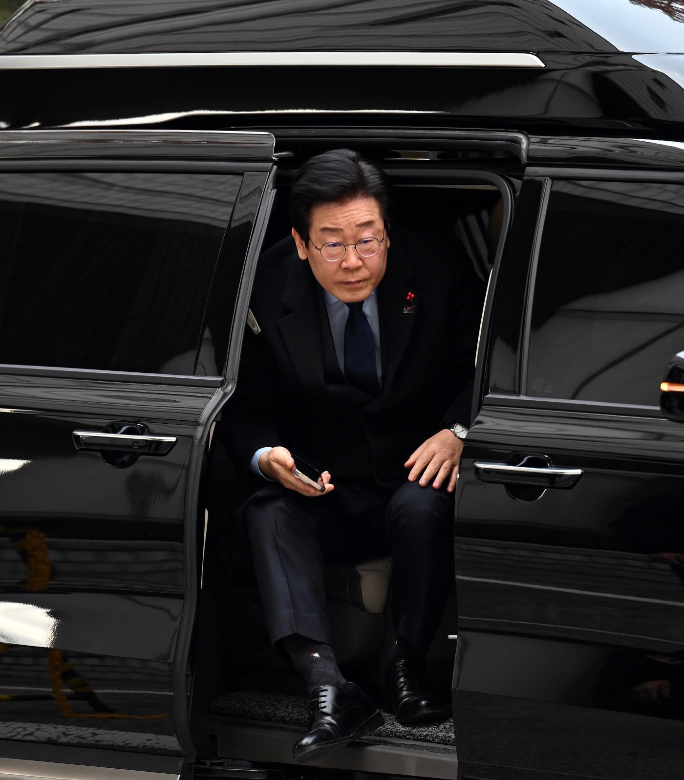 더불어민주당 이재명 대표가 17일 서울 서초구 서울중앙지법에서 열린 '대장동 배임·성남 FC 뇌물' 관련 1심 속행 공판에 출석하며 법정으로 향하고 있다.
